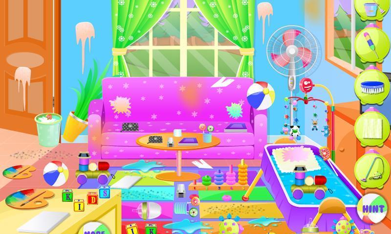 After playing the house is very dirty! Help mommy cleaning the room. It’s dusty and a mess! Clean up the mess, dust, vacuuming and cleaning. When the living room is cleaned and tidy the kids need a bath!