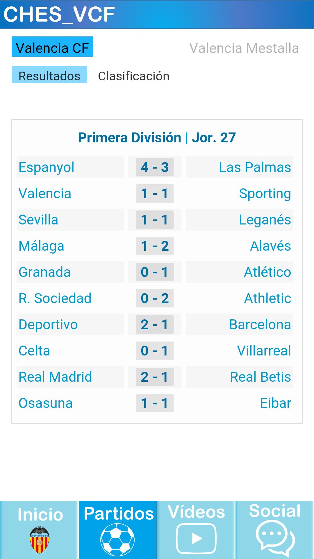 - Parties: a quick way to access the results and the classification of Valencia CF and Valencia Mestalla.