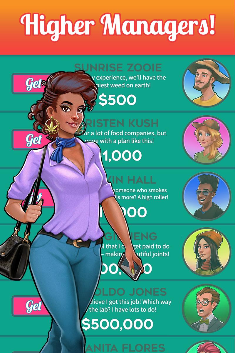 Start by buying a growing operation and earning dough from your dank plants. Once you’ve earned enough, you can start a professional joint rolling operation to keep your clients happy. Business is booming! Add a “special” bakery to your pot-folio. Keep investing and building your marijuana empire. Soon you’ll be earning cash so fast you’ll need to hire managers to run things while you’re busy!