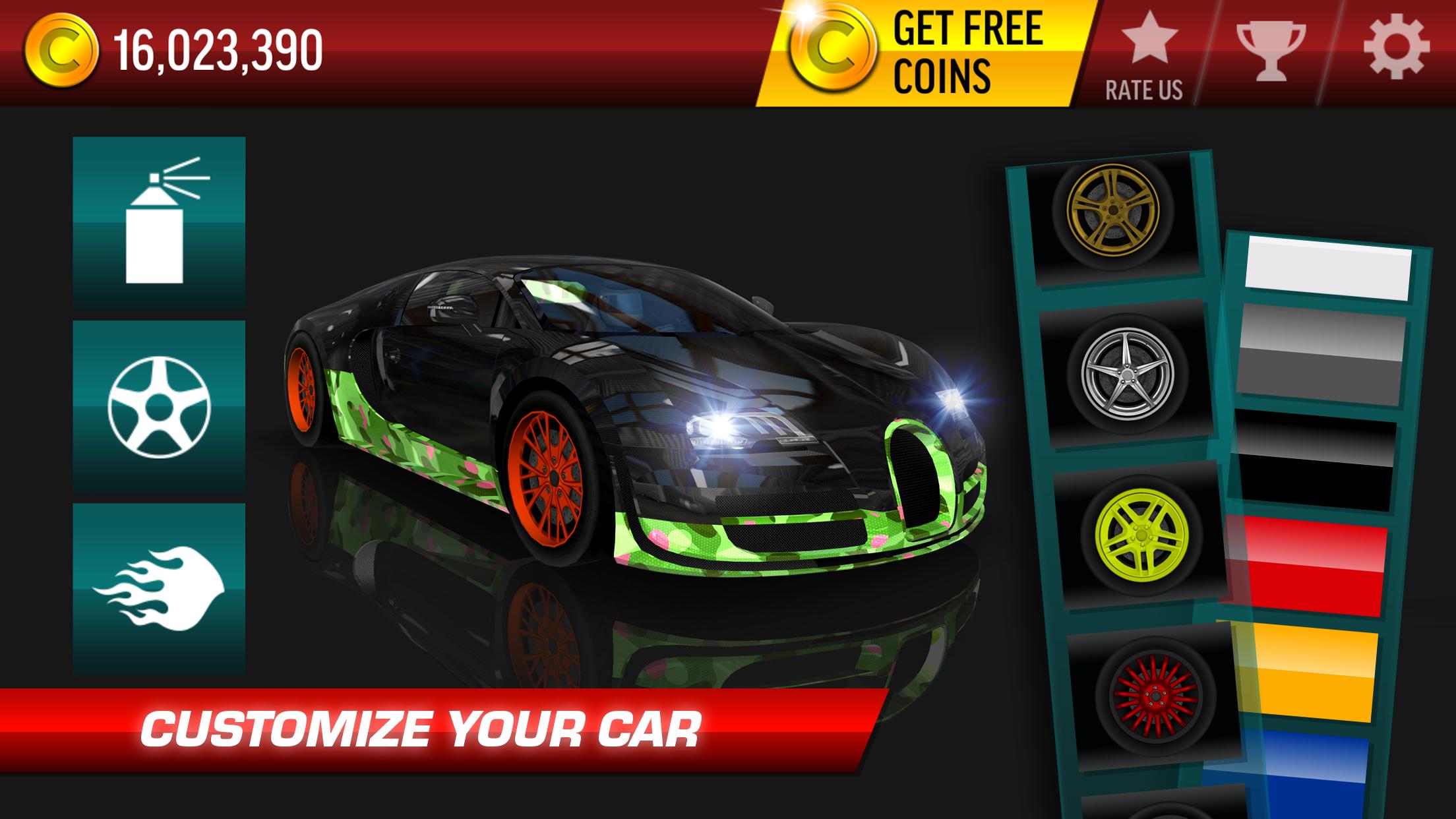 - Car customization and modification: Paint your car with 25 different colors. Customize your machine with a variety of decals and rim modifications.