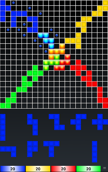 The game is played on a square board divided into 20 rows and 20 columns, for a total of 400 squares. There are a total of 84 game tiles, organized into 21 shapes in each of four colors: blue, yellow, red and green. The 21 shapes are based on free polyominoes of from one to five squares (one monomino, one domino, two trominoes/triominoes, five tetrominoes, and 12 pentominoes).