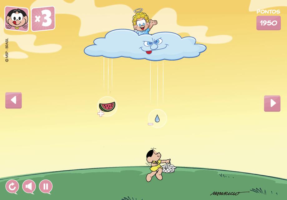 In this game, a little angel is trying to help Magali to kill your hungry, but a little naughty cloud will hinder this mission. While the little angel is playing various kinds of fruits from the sky (orange, papaya, apple, watermelon and pear), the cloud will play rays and drops. The objective of the game is to pick up the fruits to earn points and escape from rays and drops using the arrow keys, which are in the device sides. Always, when you takes a fruit, your score increases, and the speed and difficulty of the game. You can also earn extra lives picking up Magali's icons, that fall from the sky.