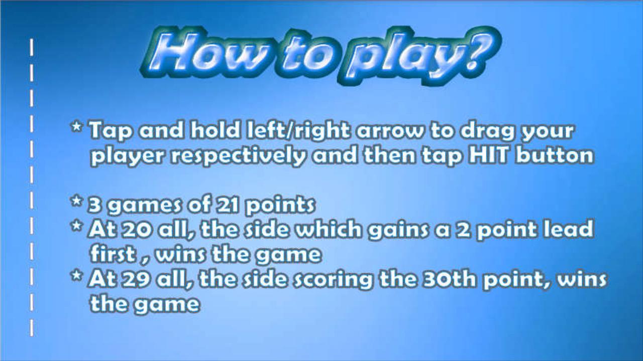 Real life badminton, Realistic physics, Beautiful 3D Drawings and all kind of Badminton Hits make this the best Badminton Game on app store for Android operating Mobile devices. Tap and hold finger on left/right arrow key to drag player, touch HIT button to Drive