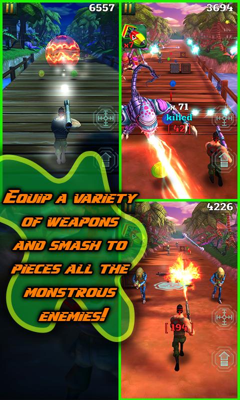 Who can stop you? Run through the jungle to fight the horde of horrible and slimy alien creatures from other worlds! The mission is to destroy all the alien spacecrafts's cores and eliminate the enemy.