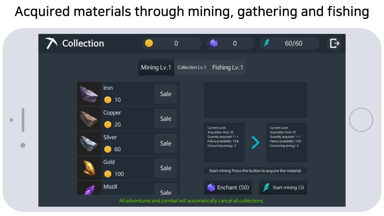 - You can automatically acquire materials through collecting (mining, gathering, fishing).
