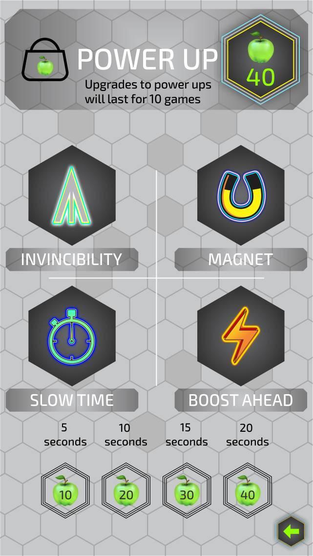 ◈Invincibility. ◈Slow Time. ◈Apple Magnet. ◈Boost Ahead.