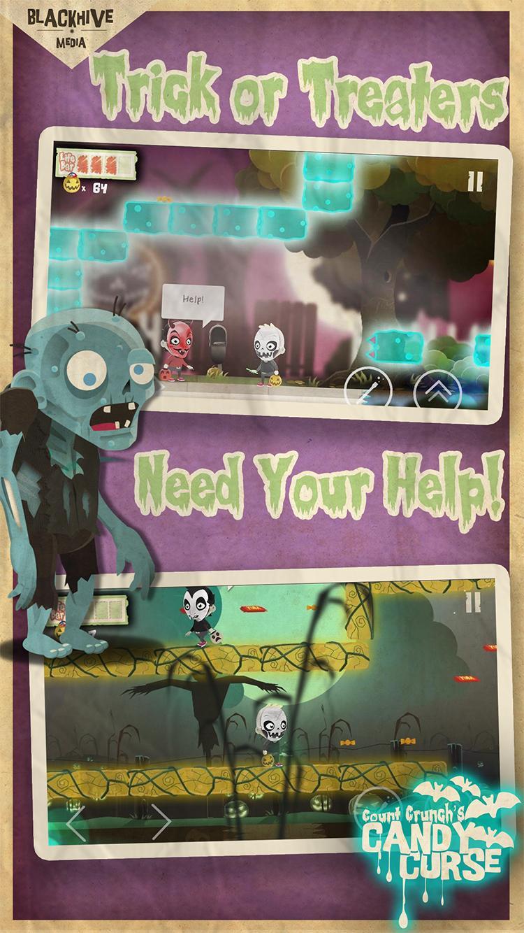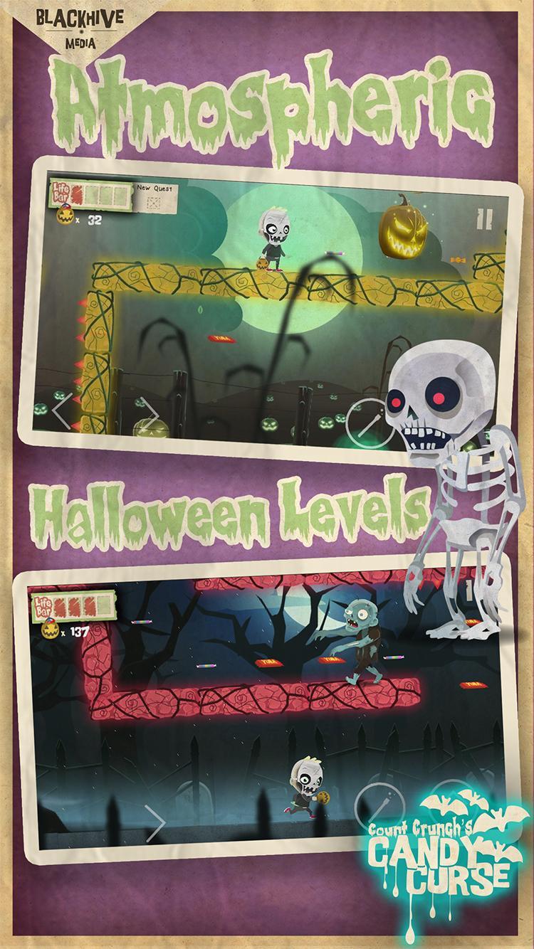 Count Crunch's Candy Curse, a "bite sized casual-core platformer" where you play as "Skeleton Boy" on Halloween night in a spooky, power-up filled, side-scrolling adventure! After opening a box of Count Crunch's Haunted Halloween cereal to obtain the free Halloween Playset, little did Skeleton Boy know that he just unleashed the Candy Curse! Count Crunch unleashes candy-filled monsters upon the town, sure to ruin Halloween and eventually take over the world! Skeleton Boy must fight his way through four visually stunning landscapes on Halloween night; along the way collecting stickers, and unlocking special abilities to help stop Count Crunch once and for all!