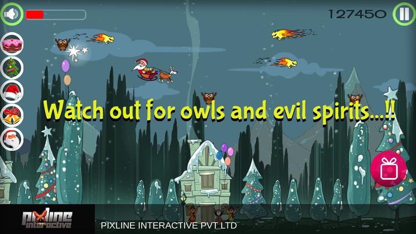 * Tap the screen to guide Santa on his sleigh without hitting the owls, the houses or the evil spirits.