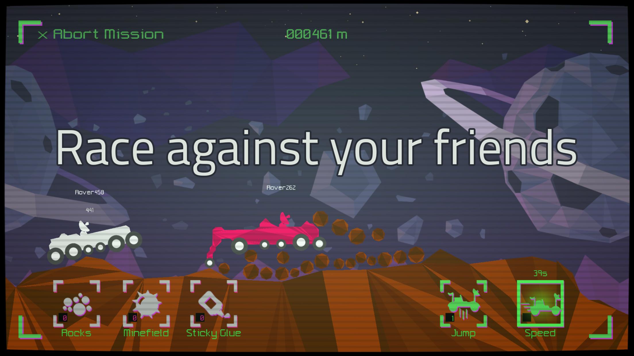 The only limit is your imagination - step away from the conventional and make your rover as weird and oddly-shaped as you want. Simply draw the outline of your space vehicle with your finger, add up to 6 wheels (which can be resized), and then take your craft out for a test ride. Need a little help? Try one of the power-ups to either hover up or get a boost of speed forward. Not going as far as you’d like? Start from scratch and try a new design!