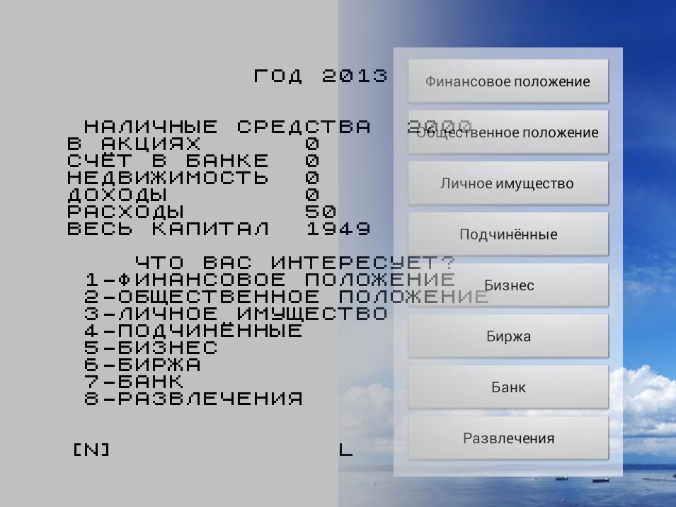 Old-school TEXT based strategy. This game is remake of old russian ZX Spectrum game, which perhaps was also someone's remake. =) The player's task - to rise from the bottom in a mythical country and become its president.