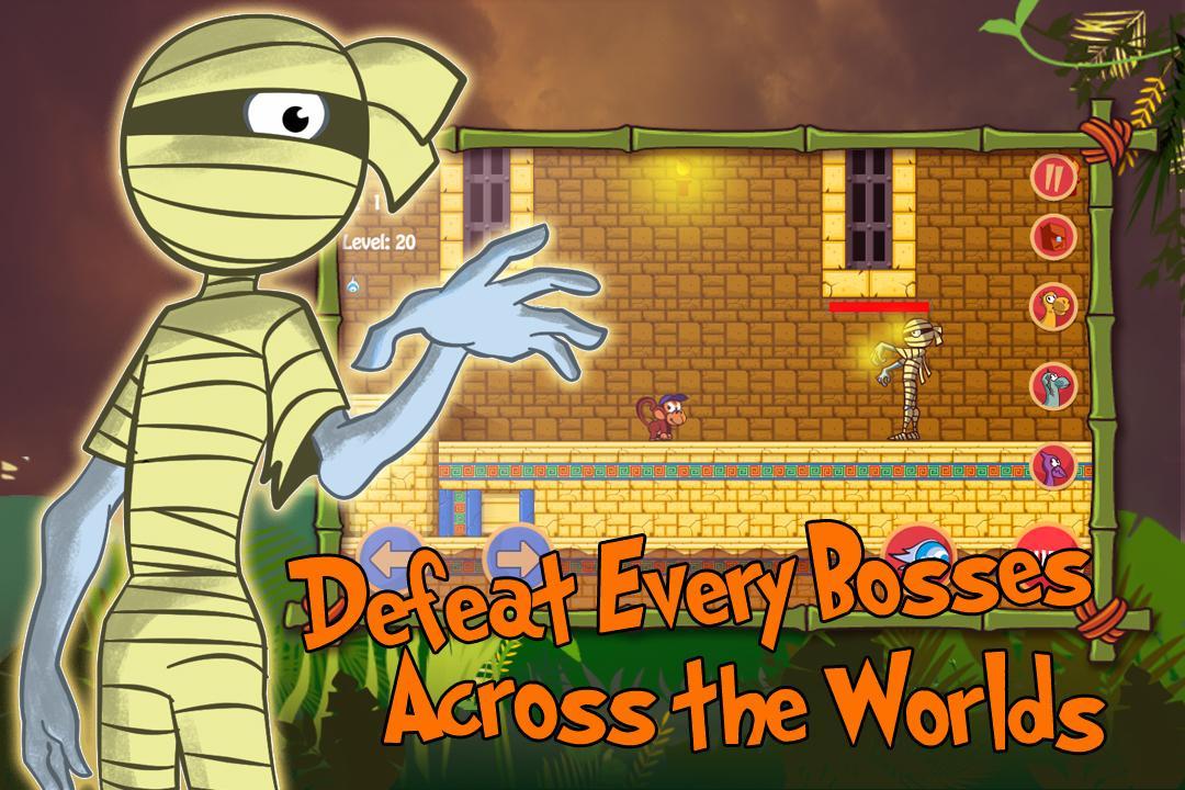 Super Monkey is made of different game levels; each is unique with new level of challenge and awesome dynamics. In the last level of each world the Hero will have to defeat the final boss with different powers and abilities….help him to win the battles!