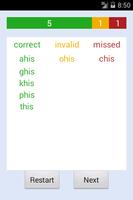 The next screen displays the results of the user input: correct words are shown in the first column in green, missing ones in the third column in red, and in the second column, in yellow, words that were submitted by the user but were invalid.