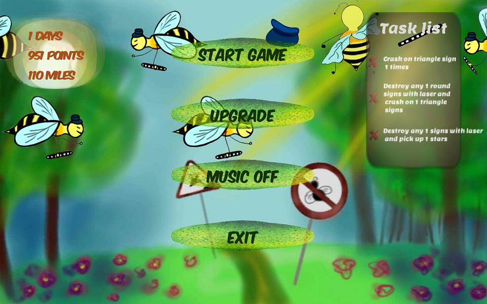Earned points can be spent in the tab “Upgrade”, improving one of the three abilities of bee. The first ability is laser, with it you can kill road signs and annoying bad bees. The second ability is protective sphere, it will completely protect you from the bad bees for some time. The third ability is a bonus life, If you crash on any sign you are able to continue your flight. If you don't have enough points for something, it's okay! You can find the board with a variety of tasks on the tab “Menu”. Execute them and get a lot more points at once!