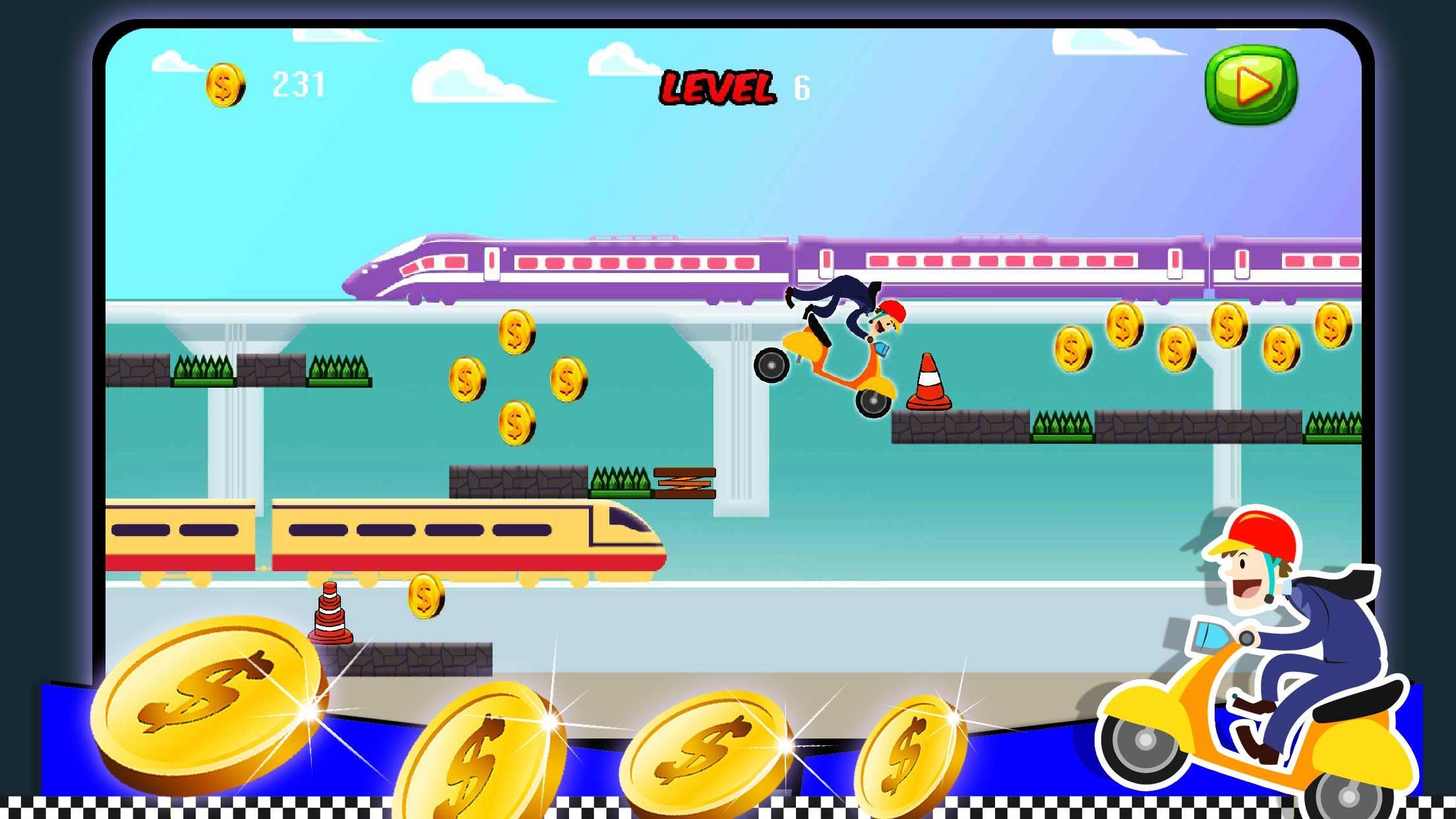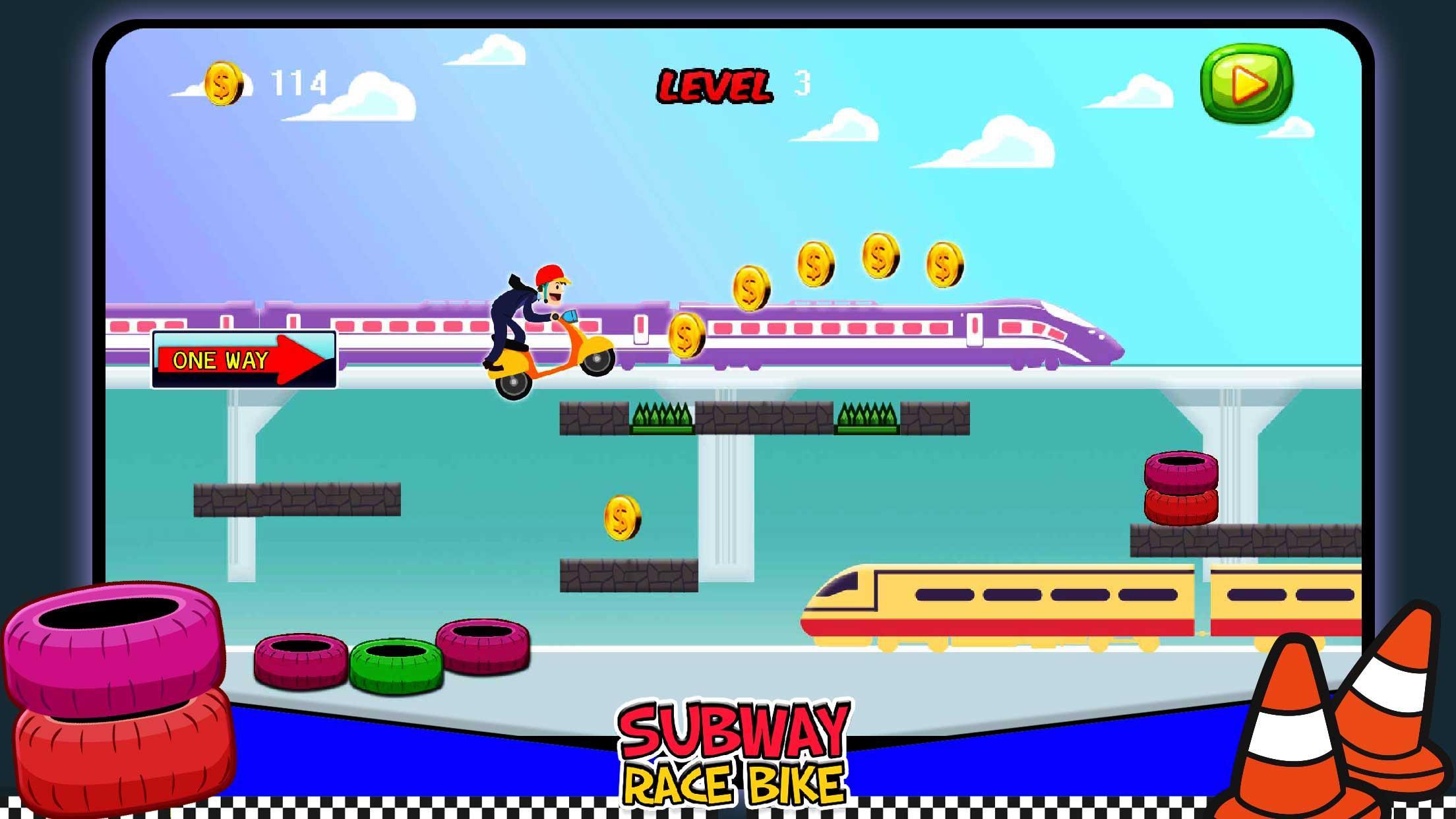 Subway Race Bike is moving forward by evading the trains and other obstacles and collect coins and other goodies on your way. Jump over the danger obstacles to be the winner. This Subway Race Bike game will provide you with an awesome race experience with its excellent graphics, simple concept and easy on-screen controls.