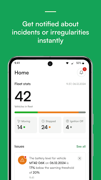 2. Pelacakan langsung, untuk menunjukkan lokasi terbaru dari kendaraan yang dipilih secara real time, serta kendaraan lain di daerah tersebut; Atau, ini menampilkan lokasi kismis perangkat seluler dan lokasi kendaraan atau pengemudi berdasarkan ini. Kendaraan dapat dipilih untuk 'diikuti' oleh aplikasi, dan layar peta akan secara otomatis diperbarui.