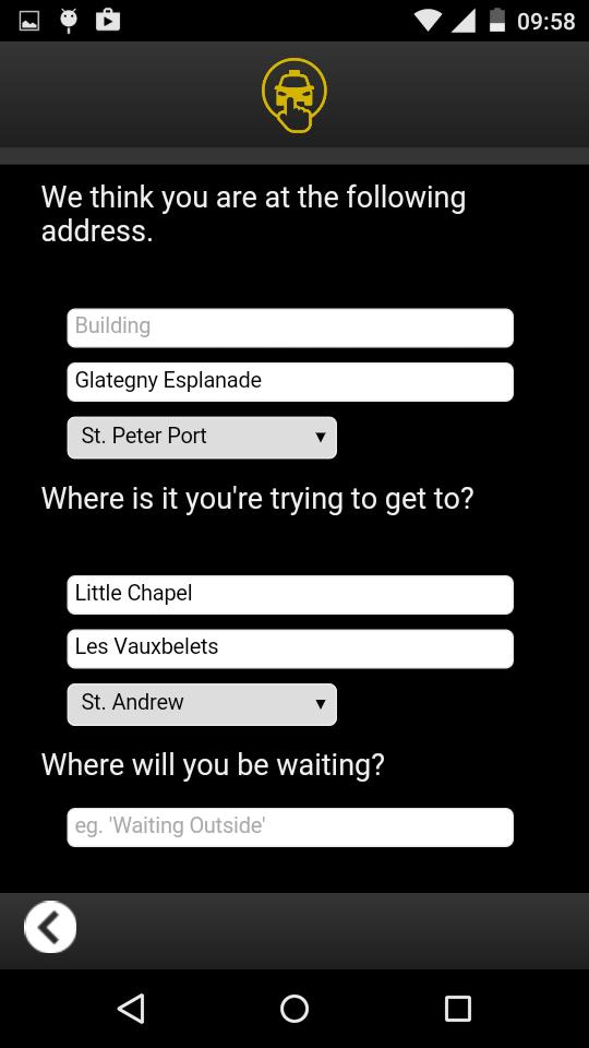 Taxi Rank Guernsey adalah aplikasi yang memungkinkan Anda untuk memuji taksi berlisensi di Guernsey dengan sentuhan tombol. Salam taksi tanpa harus meninggalkan pub yang bising untuk melakukan panggilan suara. Salam taksi bahkan ketika Anda tidak yakin dengan alamatnya - aplikasi akan menemukan lokasi Anda.