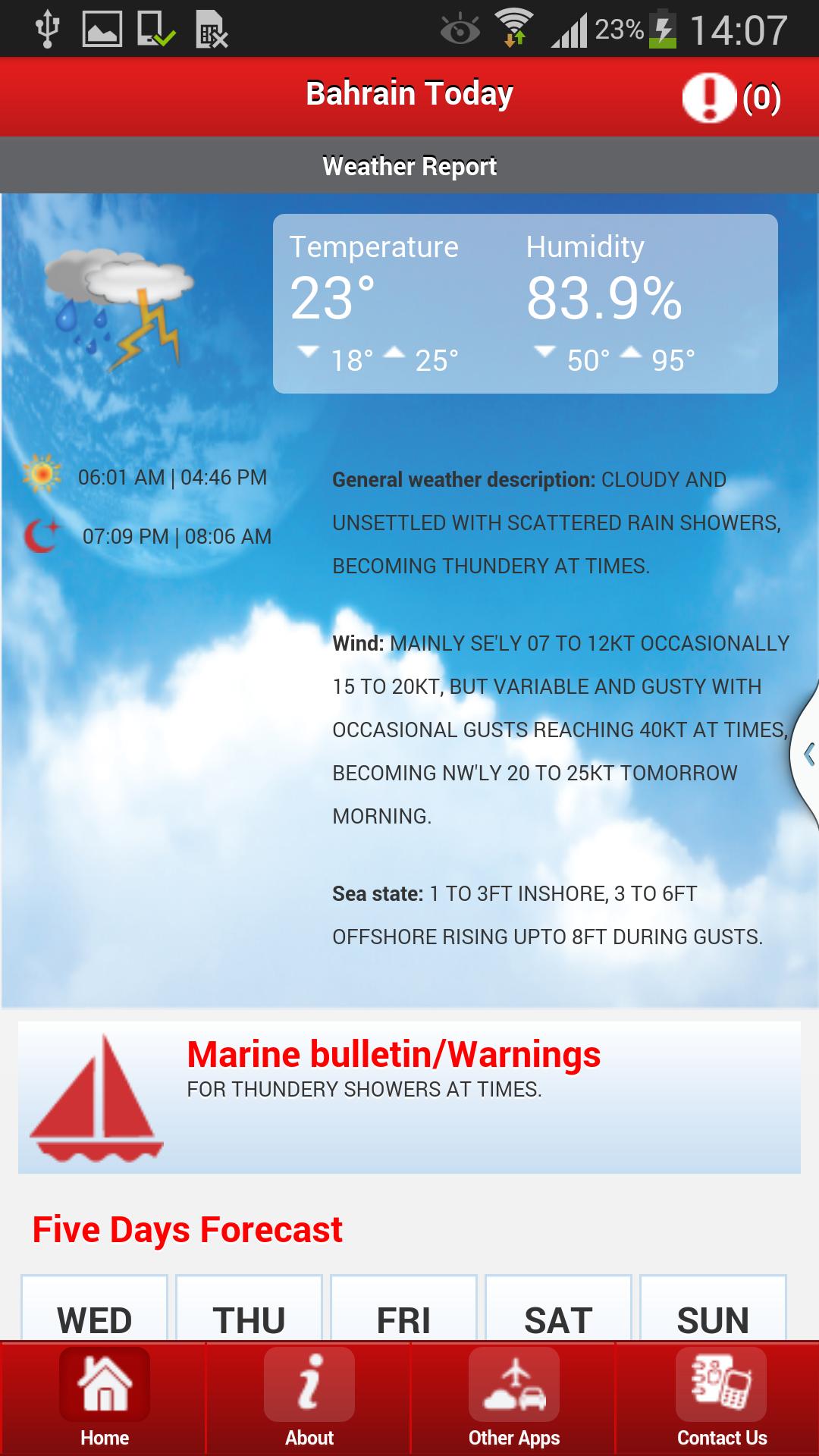 Layanan Bahrain Today bertujuan untuk menyediakan satu aplikasi berhenti utilitas bagi warga Kerajaan Bahrain untuk melihat laporan cuaca saat ini, waktu doa, acara berita & budaya. Aplikasi juga memiliki alat untuk konversi mata uang.