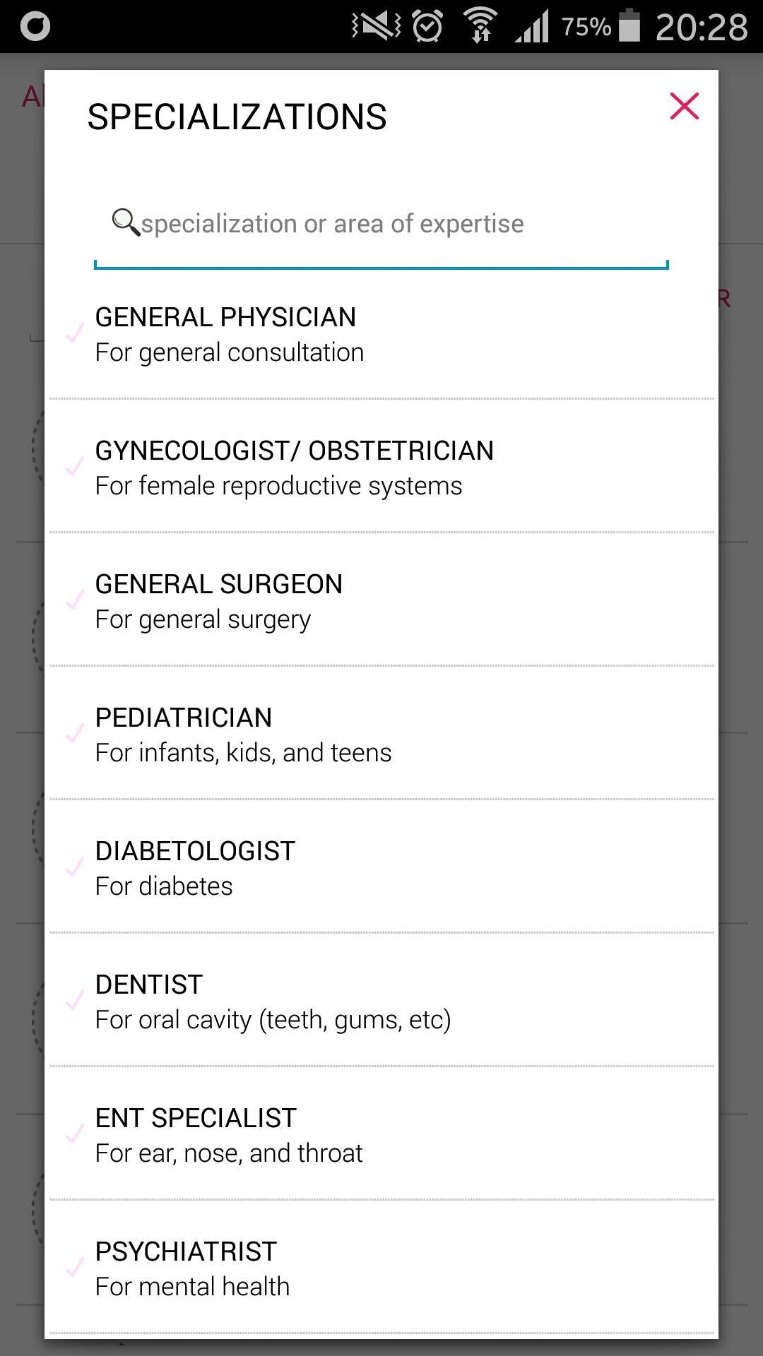 Temukan dokter tertentu dengan mudah. Yang perlu dilakukan adalah mencari bagian atau gejala tubuh yang terkena (misalnya mata, kulit, perut)
