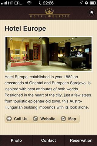Hotel Europe , didirikan pada tahun 1882 di Crossroads of Oriental dan Eropa Sarajevo, terinspirasi dengan atribut terbaik dari kedua dunia. Diposisikan di jantung kota, hanya beberapa langkah dari kota tua Epicenter Touristic, bangunan Austro-Hungaria ini menyita dengan penampilannya sendiri. Ini adalah aplikasi Android kami.