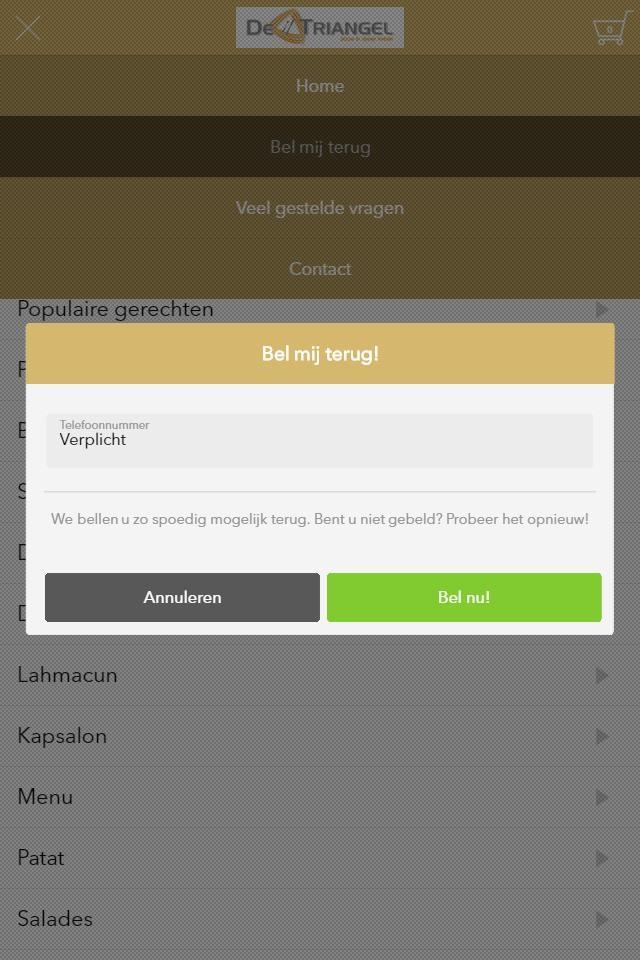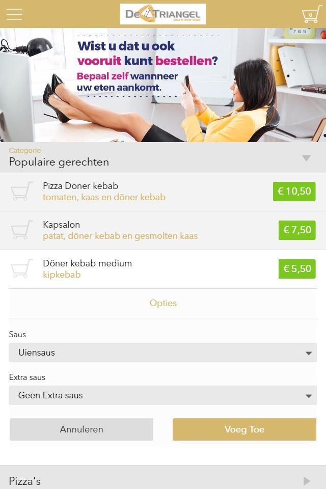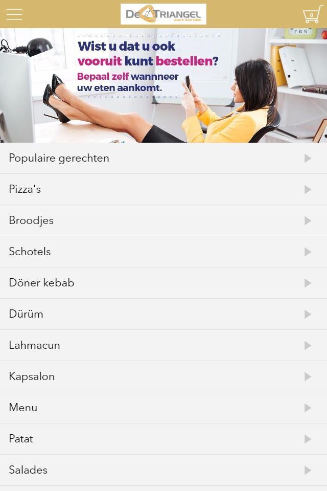 De De Triangel app is gemaakt om gemakkelijker en sneller een bestelling te kunnen plaatsen door middel van een simpele menukaart. In de menukaart kunt u onder andere kiezen voor populaire gerechten, maar u kunt ook zelf ook een menu opstellen.