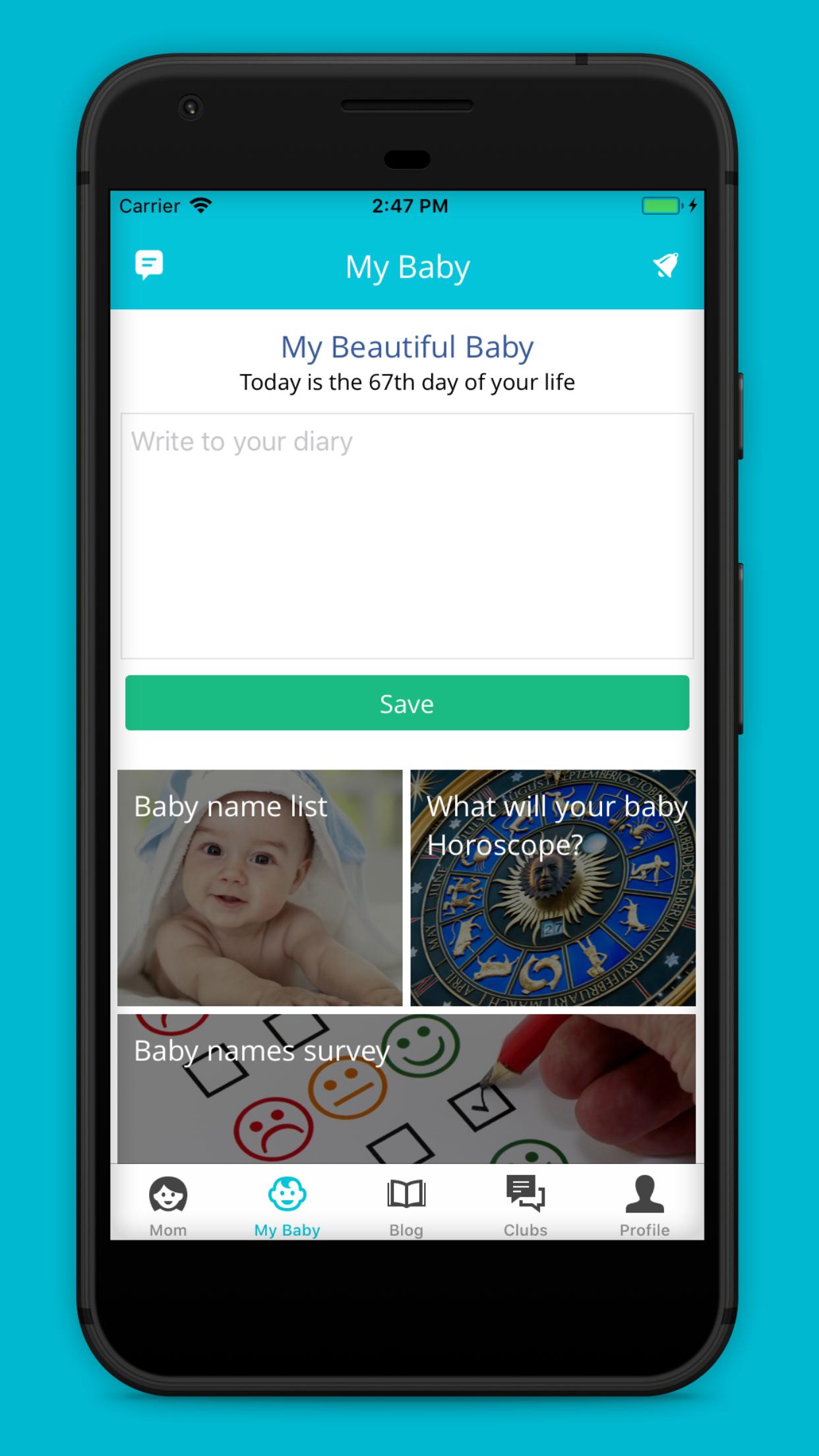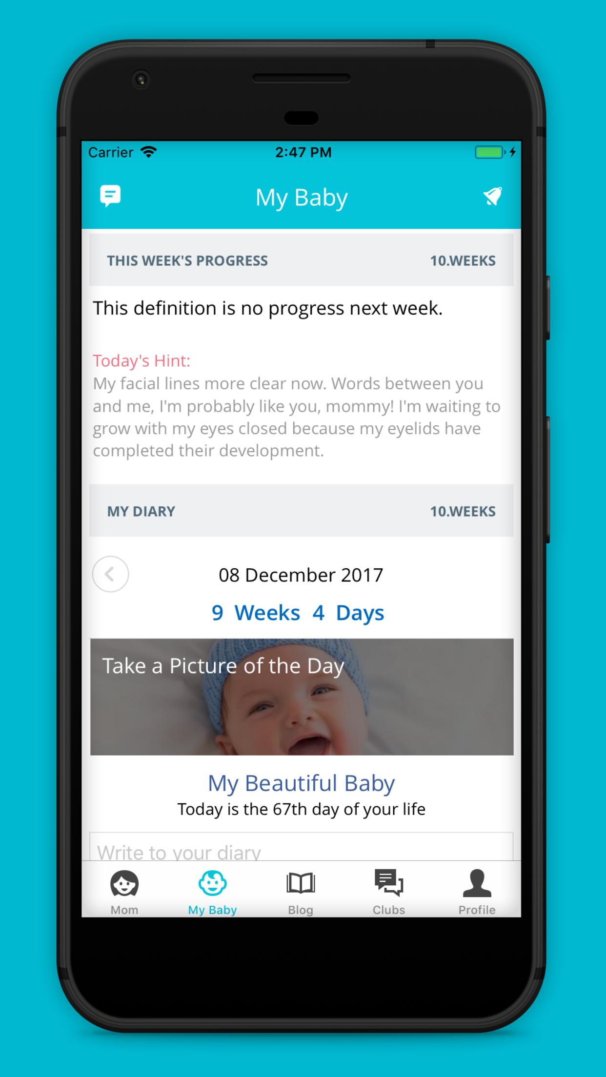 Bagian "My Diary" adalah buku catatan asli untuk semua tahap perkembangan bayi Anda. Anda dapat menulis tentang kerinduan Anda untuk bayi Anda di buku harian ini, yang kemudian akan menjadi suvenir unik untuk Anda di akhir petualangan ini. Anda juga dapat mengikuti gambar sehari-hari yang ditambahkan ke "Take the Photo of the Day" di bagian ini. Juga di bagian ini adalah kalender di mana Anda dapat mengikuti jumlah hari dan minggu kehamilan Anda.