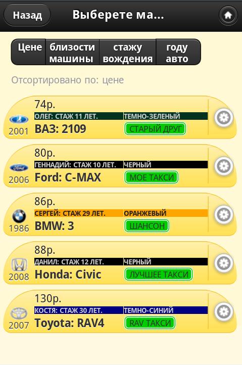 Kami naik semua taksi kota dan membuka untuk mereka pendaftaran gratis. Pada saat Anda memutuskan untuk menggunakan layanan kami, kami akan memberi Anda daftar saat ini semua mobil gratis di kota, kami bahkan akan menghitung jumlah total perjalanan Anda untuk setiap mobil, dan itu akan terlihat seperti Anda akan menghubungi 100500 taksi dari kota Anda sebentar lagi dan ditanya dengan mengorbankan perjalanan Anda. Kemudian kami akan memaksimalkan biaya perjalanan Anda untuk setiap mobil, berdasarkan kedekatan pribadinya dengan Anda. Kemudian kita akan mengurutkan semua mobil: