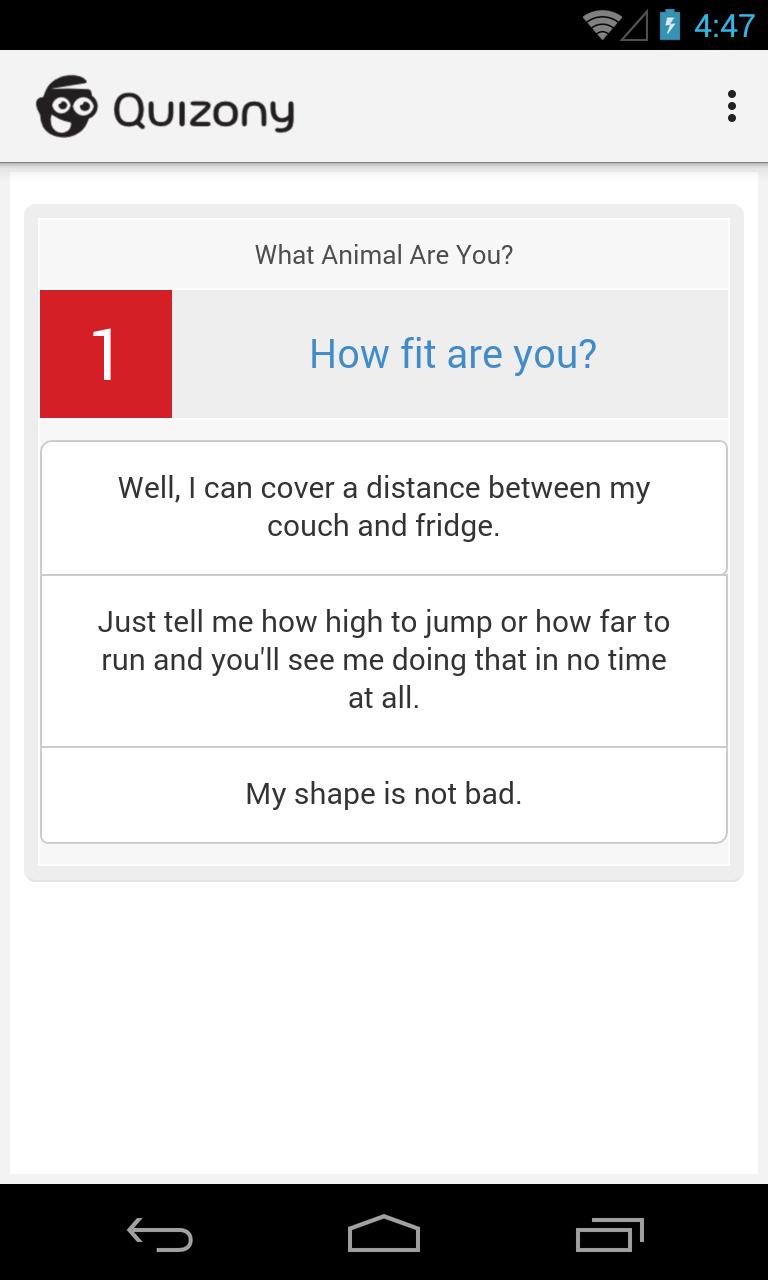 Pasang aplikasi kuis Kuisitas Quizony dan ponsel Anda menjadi peti harta karun dari semua kuis kepribadian kami yang memenangkan penghargaan dan menyenangkan, sehingga Anda dapat menghabiskan waktu yang dihabiskan untuk mengantre, mengambil bus, atau duduk di ruang tunggu dengan mengambil kuis kepribadian kami yang menyenangkan untuk anak perempuan dan orang lain, dan belajar lebih banyak tentang diri Anda dalam proses!
