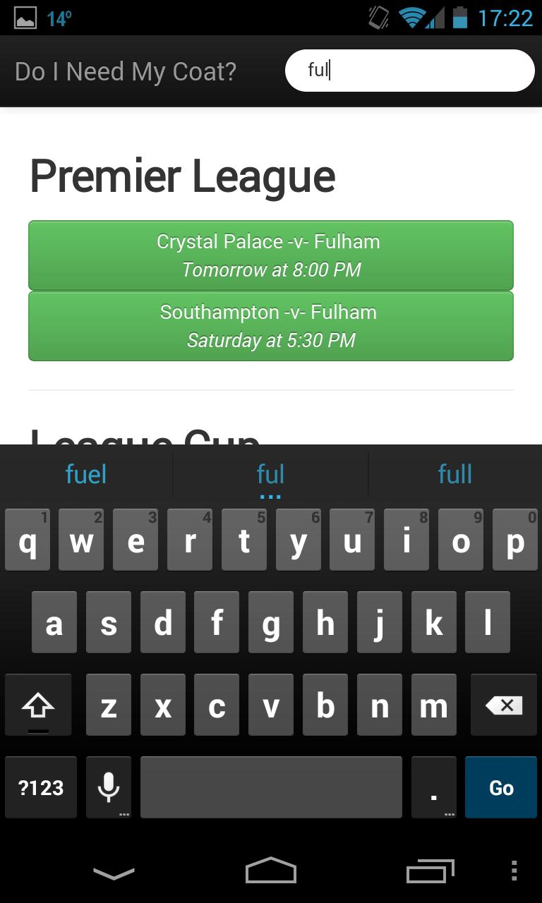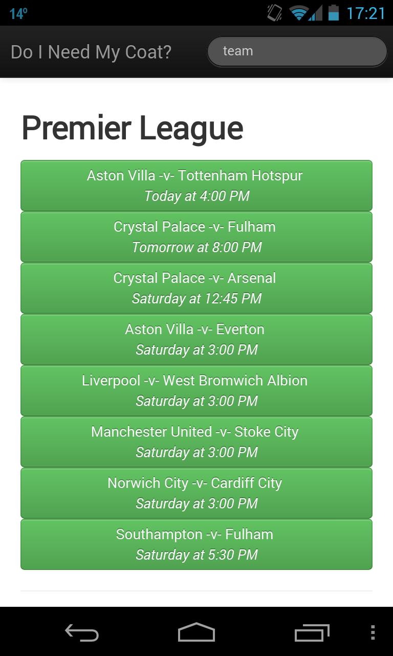 Dengan aplikasi ini Anda memiliki perlengkapan yang diperbarui selama 7 hari ke depan, dengan ramalan cuaca untuk pertandingan itu di muka dan cuaca saat ini lebih dekat ke waktu. Anda juga akan senang mengetahui bahwa Anda bisa mendapatkan nasihat perjalanan dari lokasi Anda saat ini ke tanah juga.