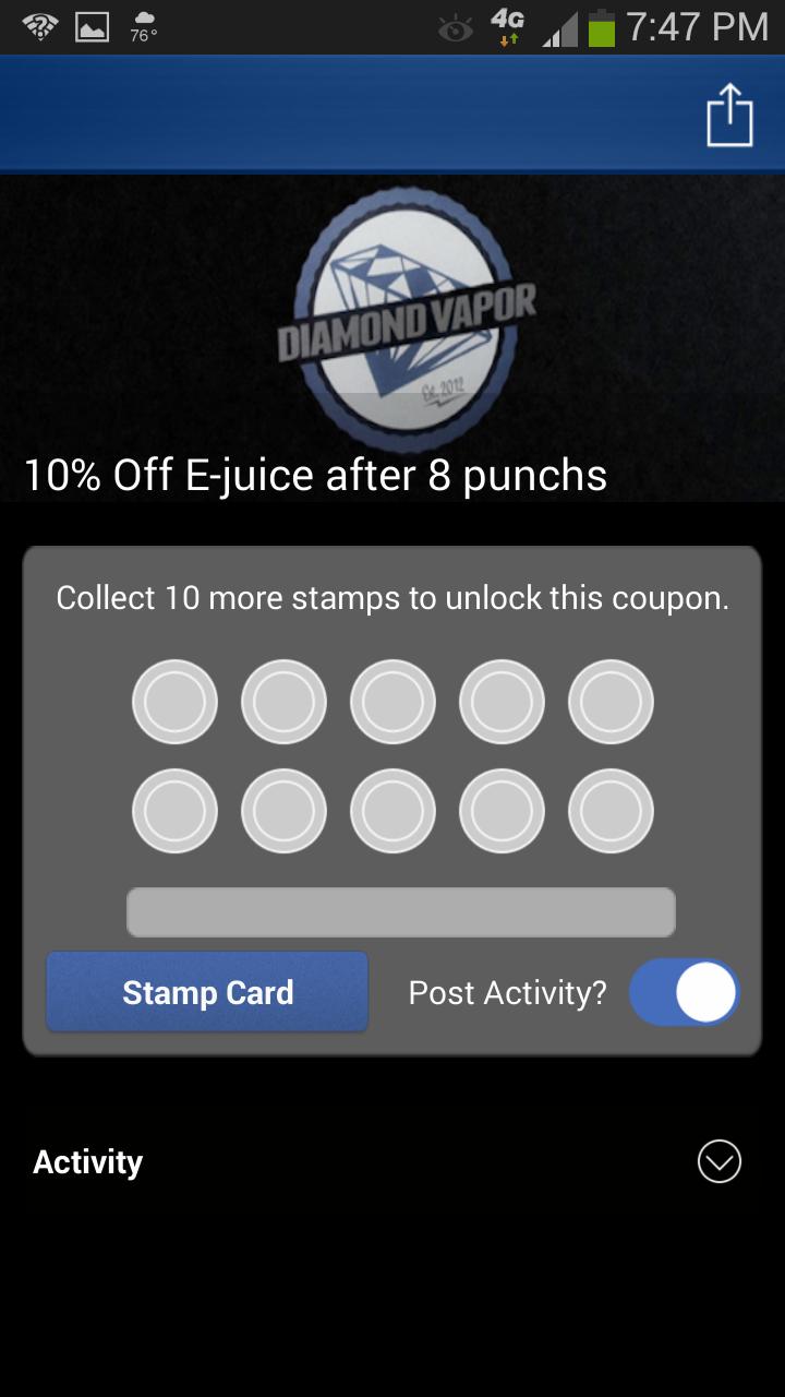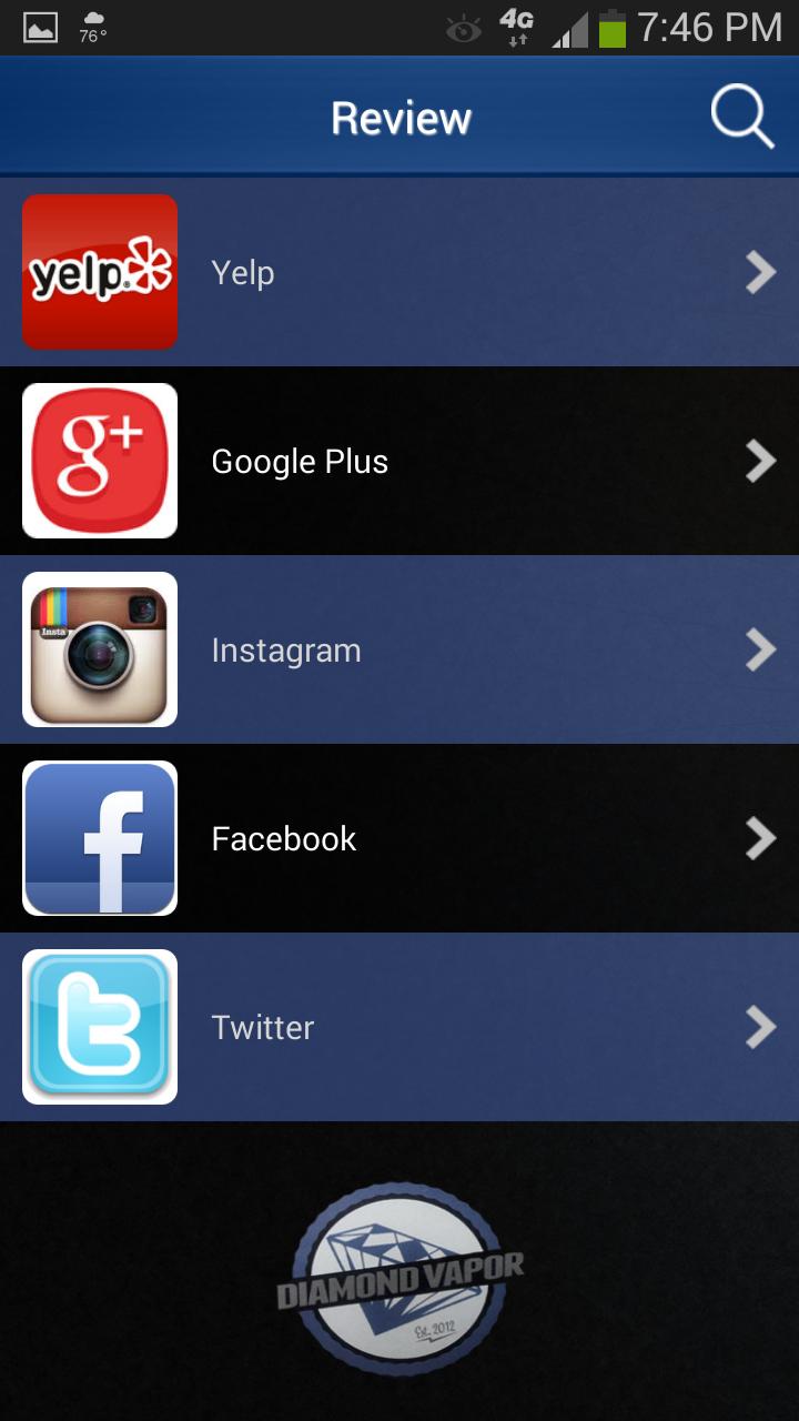 Aplikasi Diamond Vapor membuat pelanggan kami terhubung dengan kami saat mereka sedang bepergian. Ini menampilkan hadiah kupon yang berbeda untuk kunjungan yang sering. Pemberitahuan push dengan fitur pagar geo untuk diberi tahu tentang produk dan acara terbaru kami. Ini juga memberikan kepada pelanggan kami fitur -fitur lain seperti berbagi sosial dan dinding untuk komentar dan gambar mereka. Ini memiliki saluran musik untuk menghibur pelanggan saat menggunakan aplikasi. Juga menampilkan tab khusus untuk berita secara real time di seluruh dunia tentang industri rokok elektronik.