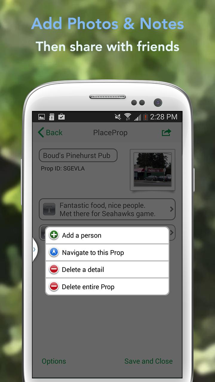 Misalnya, jatuhkan prop di alamat coffee shop lokal Anda untuk mengingat nama barista mereka, atau untuk menyimpan lokasi toko yang direkomendasikan teman di kota lain. Use PlaceProps to show friends where to meet for a hike or for dinner before a game - even if they don't have the PlaceProps app. Pantau taman lingkungan atau lampu liburan yang ingin Anda kunjungi kembali. Tandai lokasi sarang elang di cagar alam.