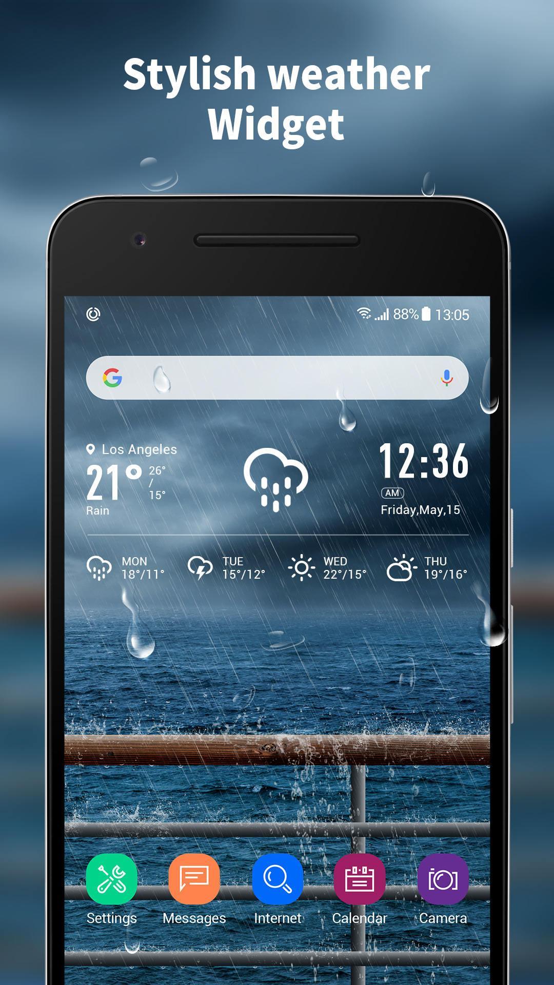 Aplikasi Weather Pro ini dikemas dengan berbagai tema cuaca dan widget jam suhu untuk menghias layar beranda Anda. Selain itu, widget cuaca untuk Android ini juga menampilkan informasi radar seperti suhu luar yang akurat, ramalan, waktu matahari terbit dan waktu matahari terbenam, kelembaban, tekanan udara, gelombang, UV, dan info cloud.