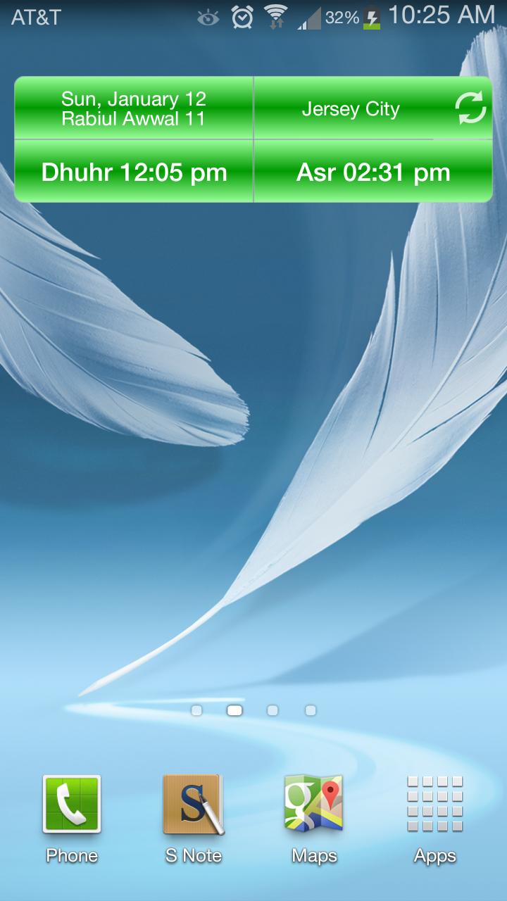 *Layar Beranda/Layar Kunci Berguna (Widget) yang menunjukkan tanggal Gregorian/Hijri, lokasi, waktu doa saat ini (WAQT) dan waktu doa berikutnya.