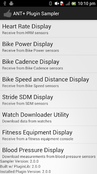 ANT+ Plugin Sampler memungkinkan interaksi dengan semua perangkat ANT+ yang didukung oleh plugin ANT+. Ini dimaksudkan sebagai alat pengujian dan kode referensi, sehingga tidak terlalu cantik dan tidak akan terlalu bagus untuk penggunaan tujuan umum. Kode Sumber tersedia di SDK Ant+ Android kami di http://www.thisisant.com/developer/ant/ant-in-android/.