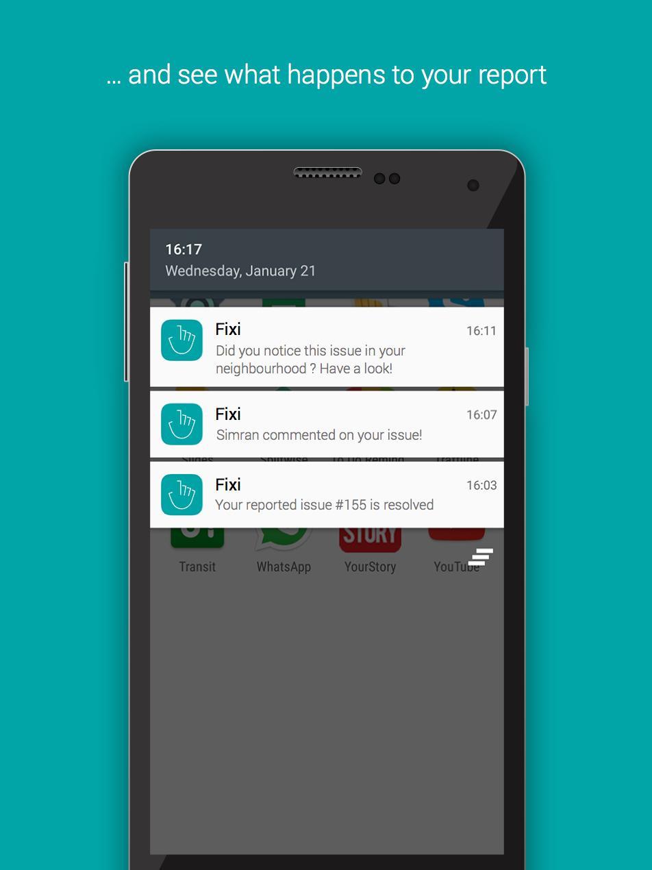 Anda akan diberitahu ketika laporan Anda dipertimbangkan oleh Dewan Kota. Dan setelah itu, Anda juga akan menerima pemberitahuan ketika masalah Anda ditangani dan diselesaikan. Fixi adalah satu -satunya aplikasi perbaikan lingkungan yang membuat Anda mendapat informasi dengan pemberitahuan push.