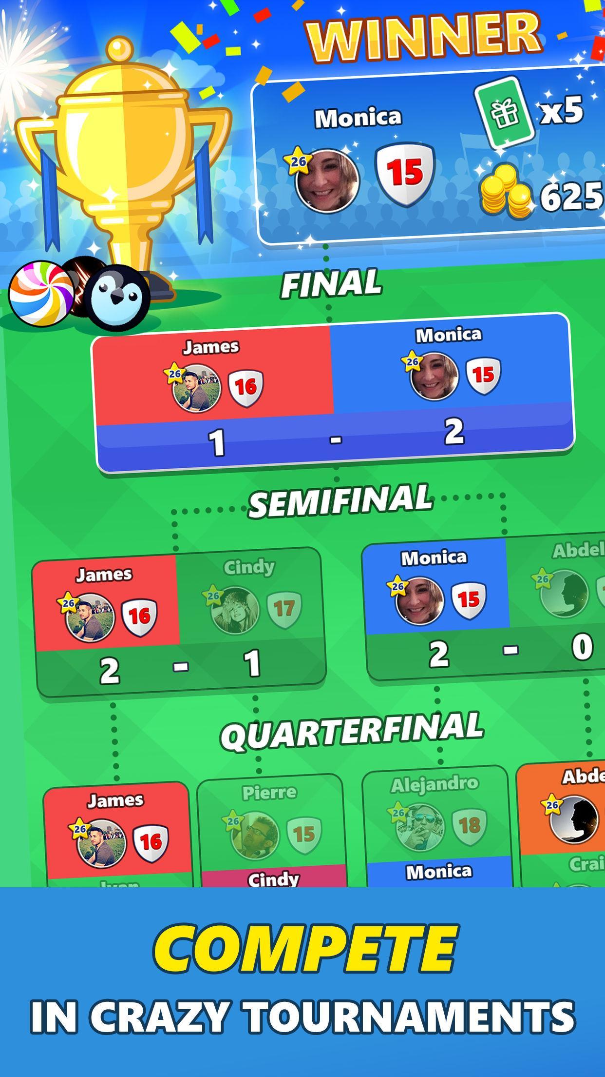 Mainkan pertandingan 1V1, 2V2, dan 4-pemain. Rasakan drama 8 turnamen knockout pemain. Setiap jam setiap jam, ambil bagian dalam turnamen khusus untuk semua yang terbuka untuk dunia