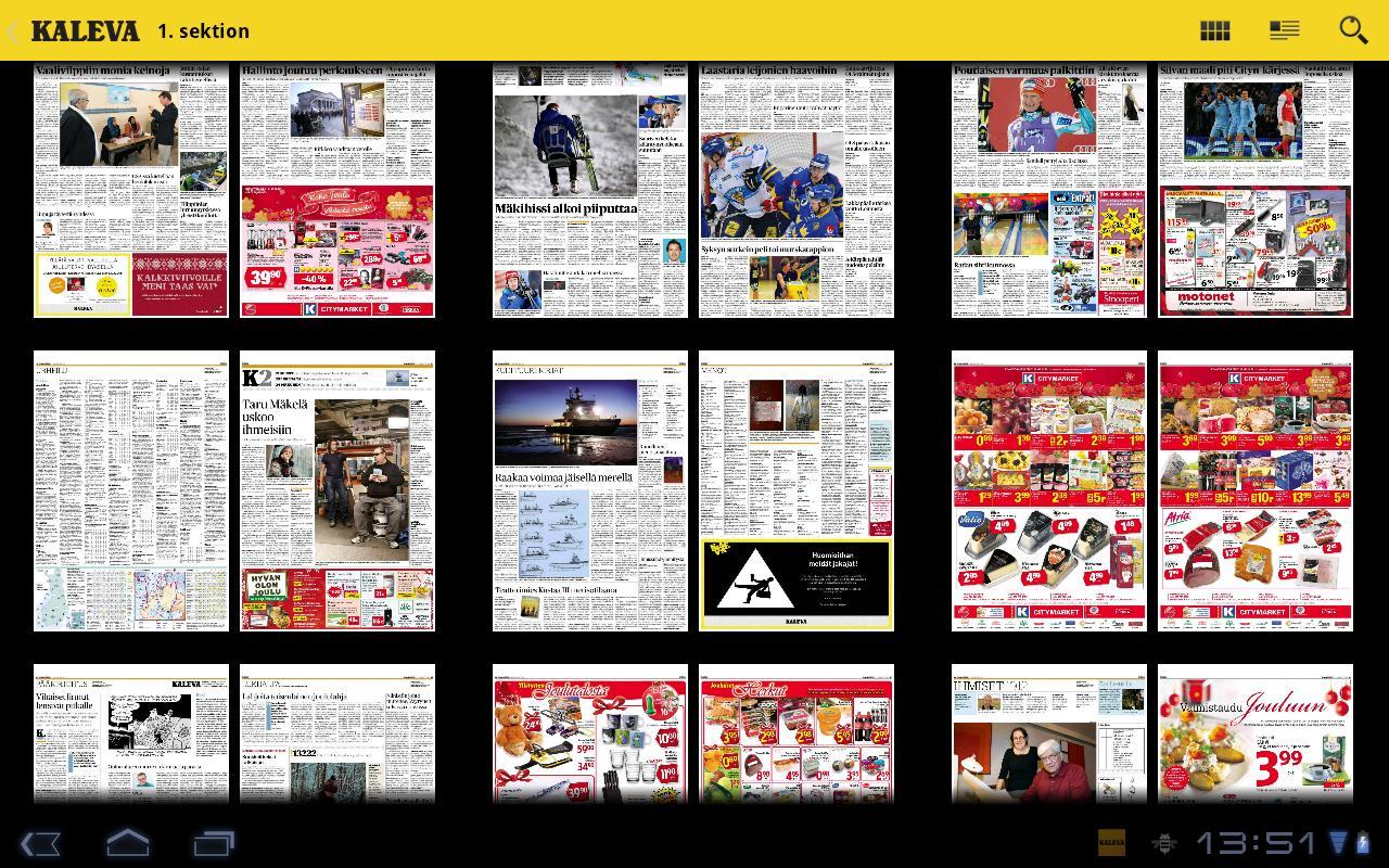 KalevaのデジタルマガジンE Kalevaには、新聞のコンテンツ全体が添付ファイルを備えており、コンテンツは小さなアイコンですばやくプレビューできます。ズーム、アーカイブ、および検索 - 機能は、e Kalevaを使用して素晴らしく簡単です。
