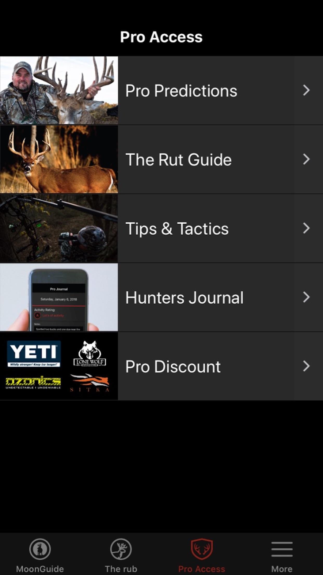 プロサービスには、ハントカレンダー、プロコンテンツとオファー、および専門家に「質問する」