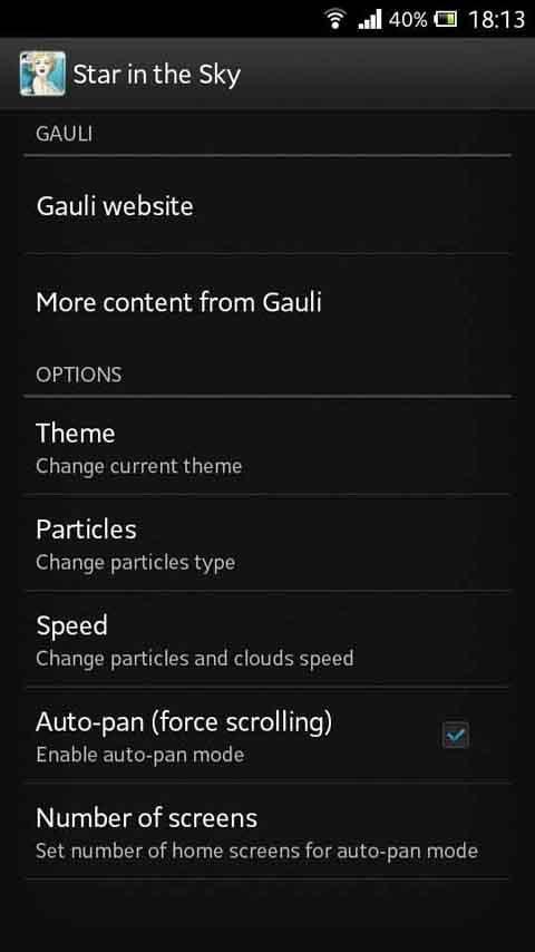 RAMの使用は完全に完全に最適化されており、これまでのところ、予期しない閉鎖を生成できるため、SDカードにインストールされないことを選択しました。ライブ壁紙を使用するには、アプリケーションアイコンが表示され、ライブ壁紙のメニューに直接移動し、そこで選択します。