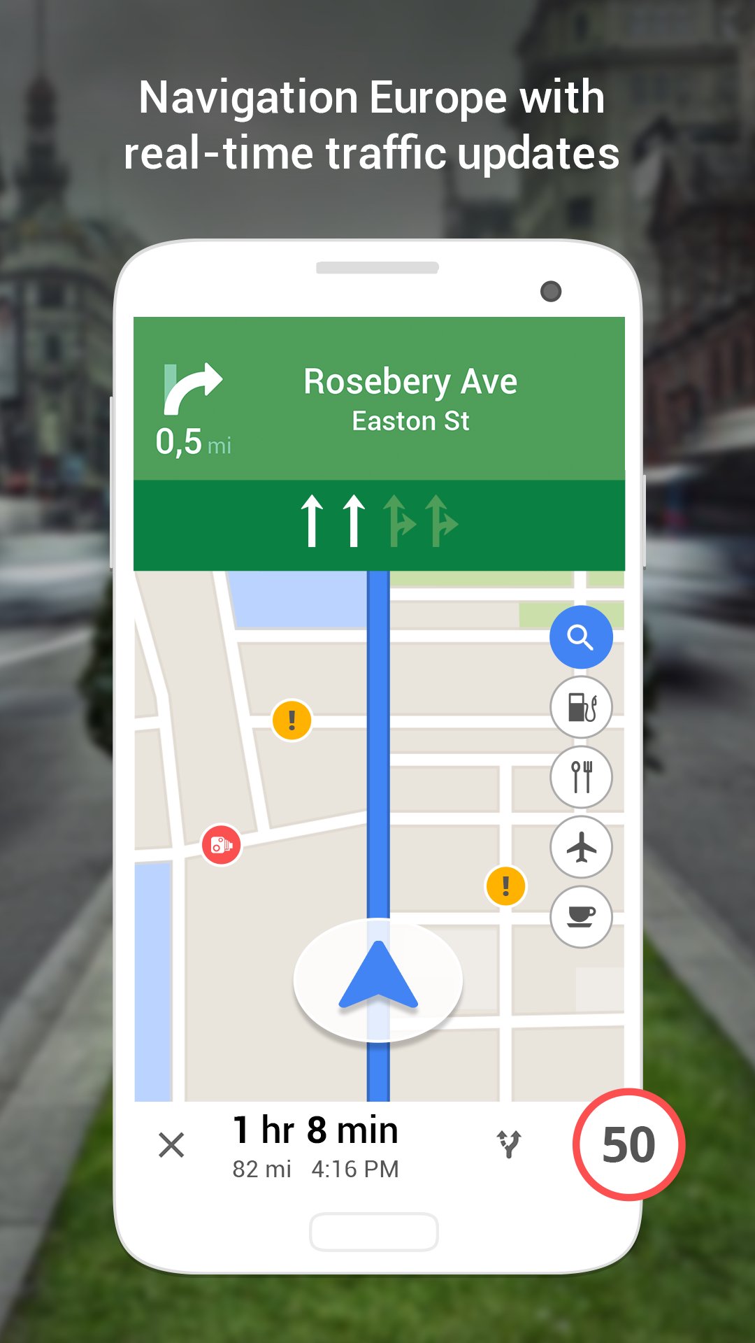 ヨーロッパ向けの最高かつ最も正確なナビゲーションと地図により、市内の移動が簡単になります。ヨーロッパの全地図が無料で含まれています。リアルタイムの交通情報更新により、より速く目的地に到着します。ヨーロッパを旅する途中で、食事、コーヒー、宿泊施設に立ち寄るのに最適な場所を見つけてください。