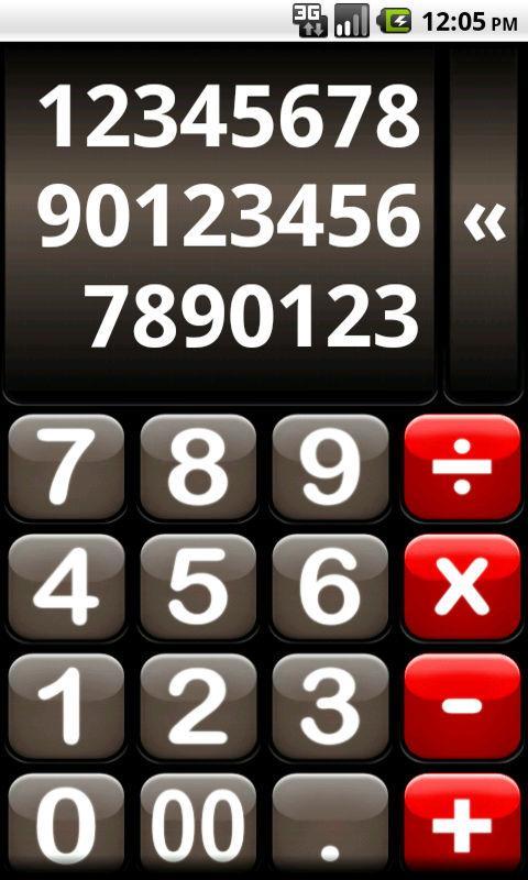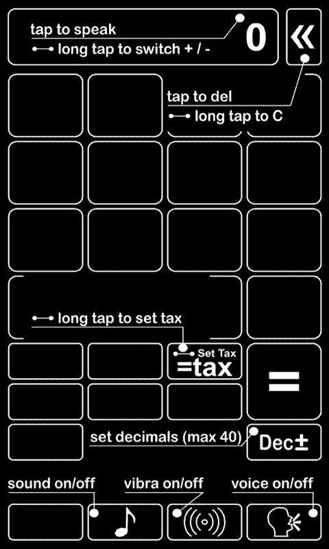 Easy Calcは、大きなボタンを備えたTalking Calculatorであり、ディスプレイに無制限の数値を入力できるようにする唯一の種類です。また、税金のスピンオフ /追加 /減算、主な科学機能、無限の数字を保存する能力に有用な機能が含まれています。