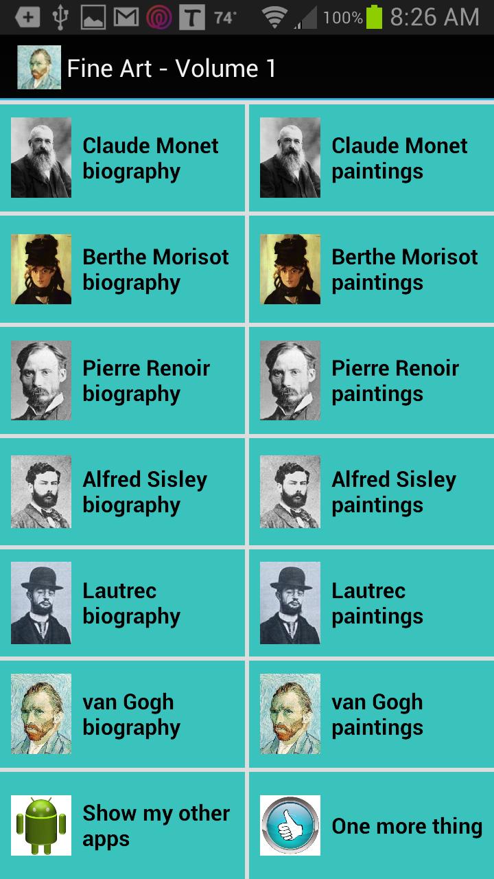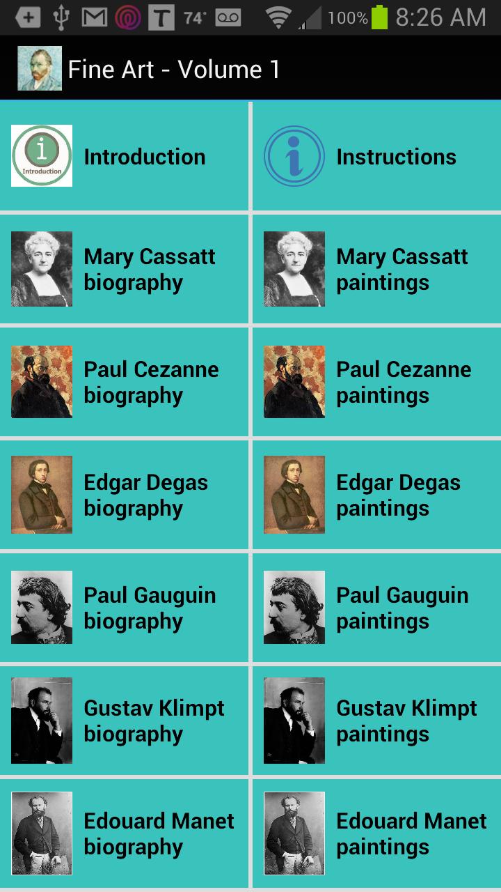 12 人のフランス印象派の著名な芸術家の作品コレクションをお楽しみください。彼らの最も有名な絵画のそれぞれ 25 点を、タイトルやその他の関連情報を備えたフルスクリーン画像として表示できます。