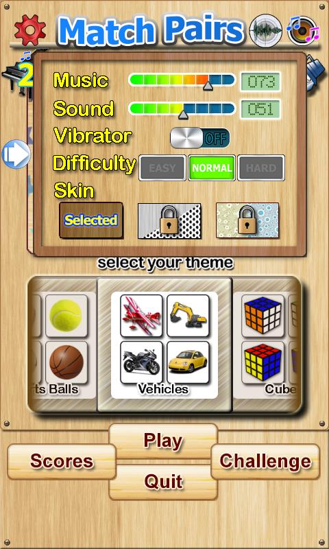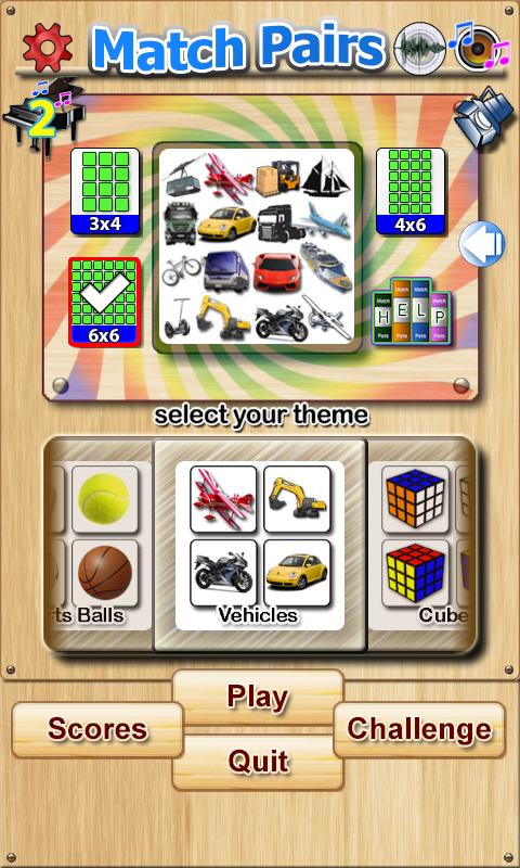 ただし、「チャレンジ」モードは、特定の期間で難易度(簡単-3x2、通常-4x6、ハード-6x6)に応じて、選択可能なテーマ、固定カードアレイで再生できます。