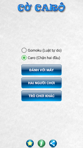 + caro(ブロックされたルール - ゴモクとも呼ばれ、ベトナム人の間で人気があります):勝者には、両端でブロックしてはならない5つの石のオーバーラインまたは壊れていない列が必要です。xooooooxとoxxxxxoは勝利ラインとしてカウントされません。