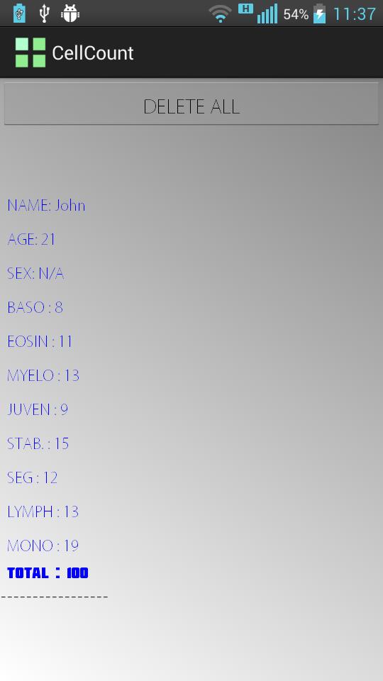 CellCount 도달 범위를 100 CellCount 경고하고, 저장 및 뷰 수를 알리는 능력을 가진 혈액 샘플 세포를 나열하는 응용 프로그램입니다.