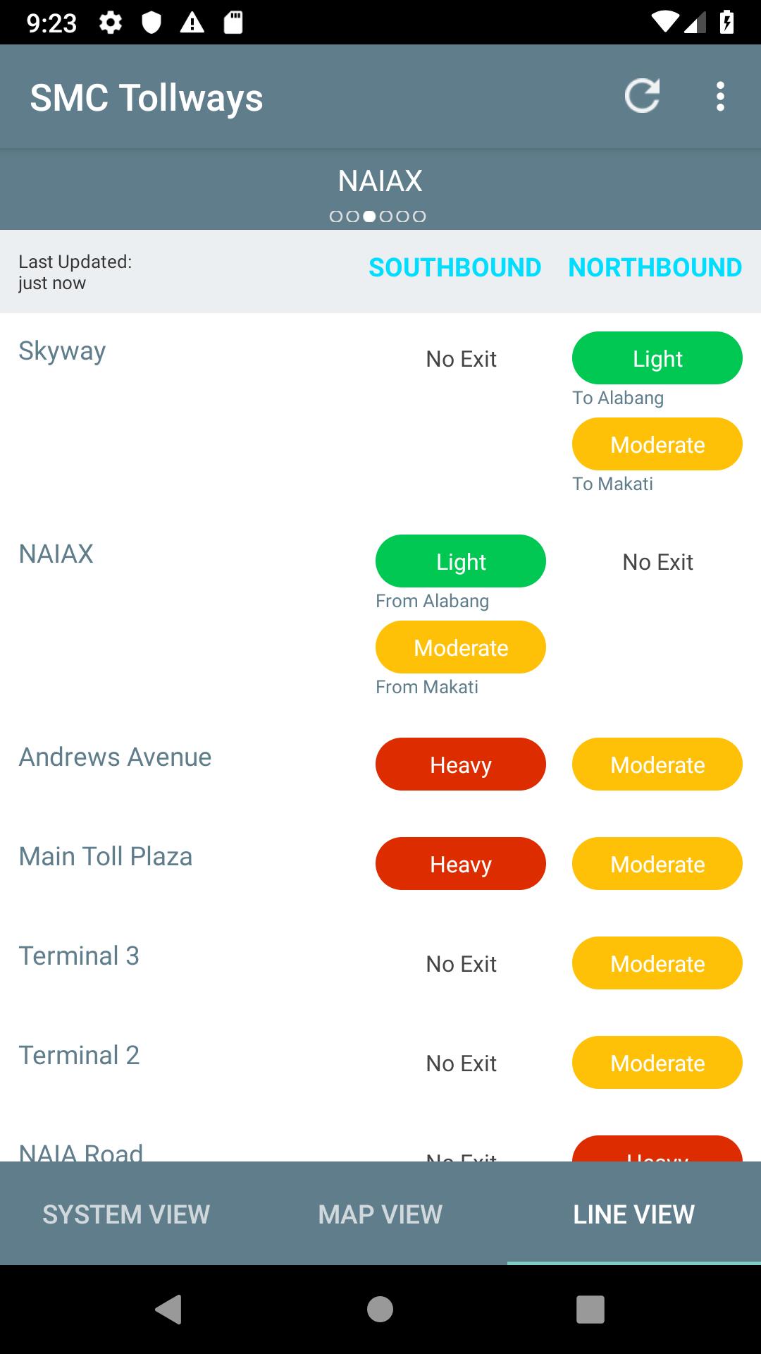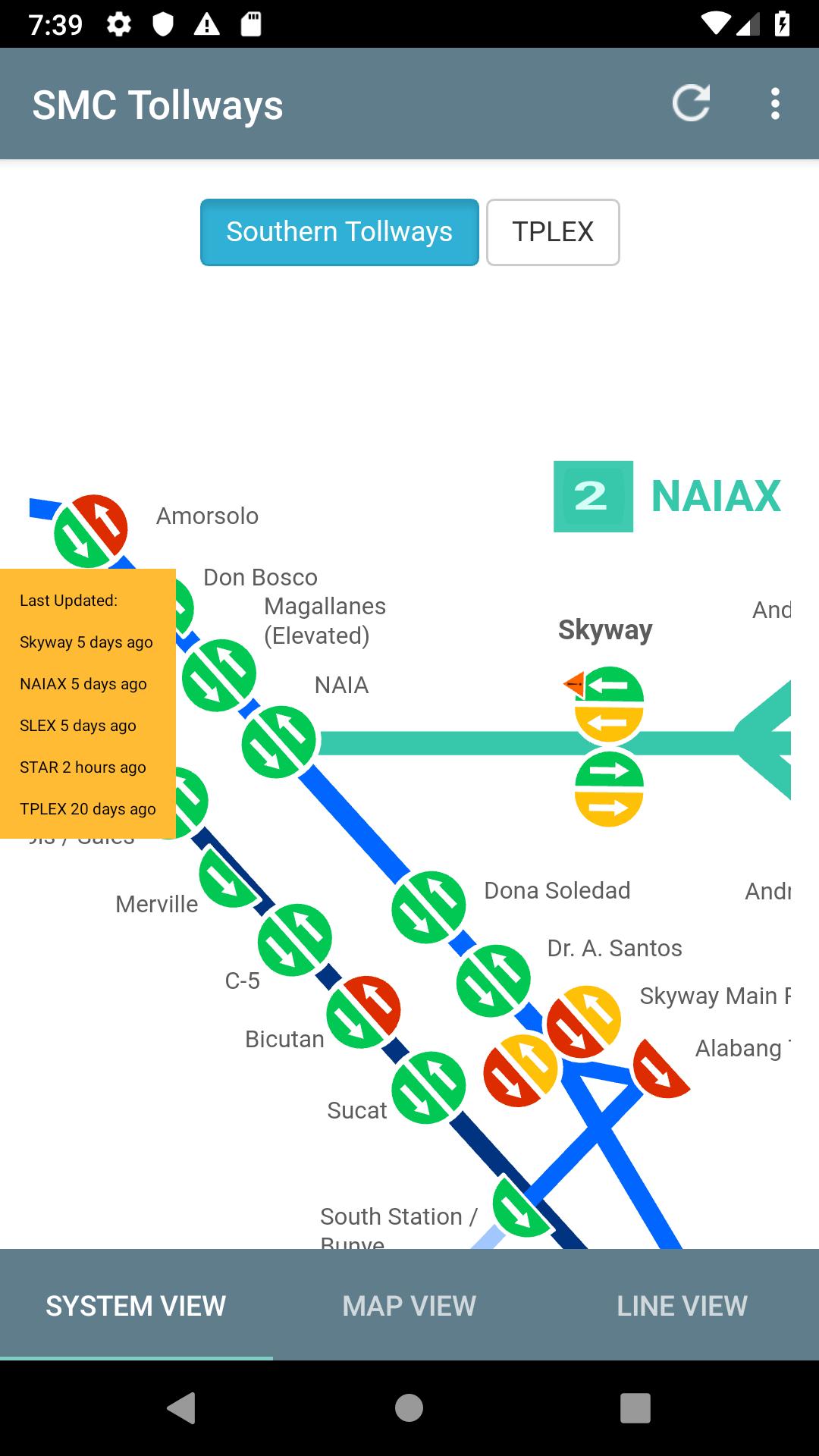 Skyway, Naiax, Slex, Star 및 Tplex Tollways에서 트래픽 상황 (Light, Compleate, Heavy)을 실시간으로 모니터링하십시오.