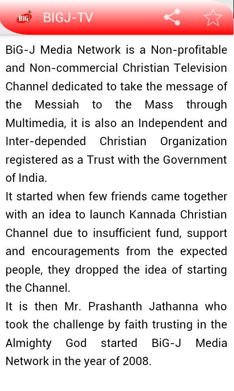 Big-J Media Network는 멀티미디어를 통해 메시아의 메시지를 미사에게 전하는 비영리적이고 비영리적인 기독교 텔레비전 채널입니다. 또한 인도 정부와의 신뢰로 등록 된 독립적이고 디자인 된 기독교 단체이기도합니다.