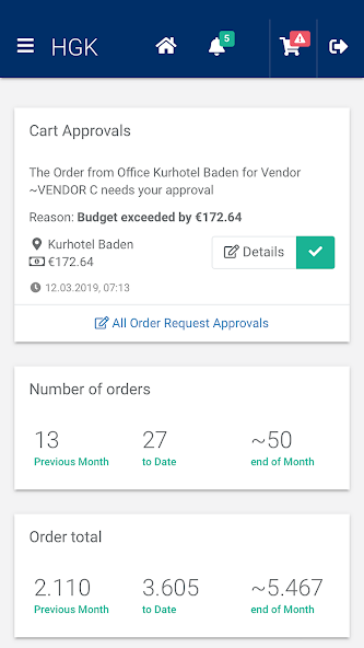 이 앱은 책상에서 떨어져있을 때에도 회사의 주문 프로세스를 처리하기위한 최적의 확장입니다. 공급 업체로부터 평소와 같이 주문하고 공개 구매 주문을 주시하십시오. 국가 또는 지역에 적절한 설정을 갖춘 호환 장치가 필요합니다. 앱은 회사에 대해 활성화되어야 하며이 앱의 혜택을 얻으려면 등록 된 HGK-AllOrder 사용자 여야합니다.