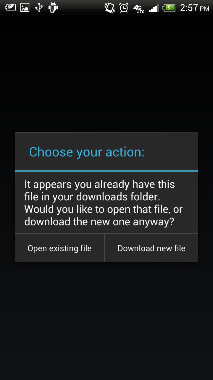 다운로드 마다이 앱은 파일이 다운로드 폴더에 이미 존재하는지 확인합니다. 그렇다면 기존 파일을 열거나 새 파일을 다운로드 할 것인지 묻습니다. 이 앱을 사용하려면 "완전한 작업"대화 상자 중 기본값으로 선택하십시오. MD5 또는 파일 이름을 사용하여 확인하는 옵션이 있습니다.