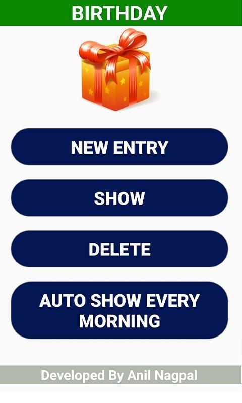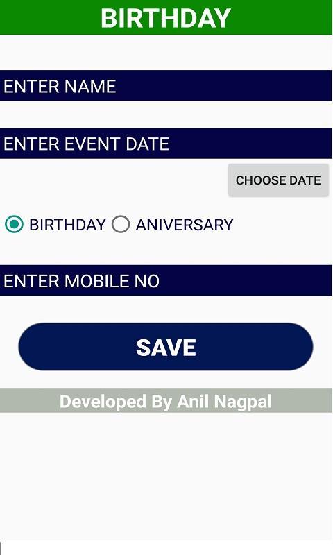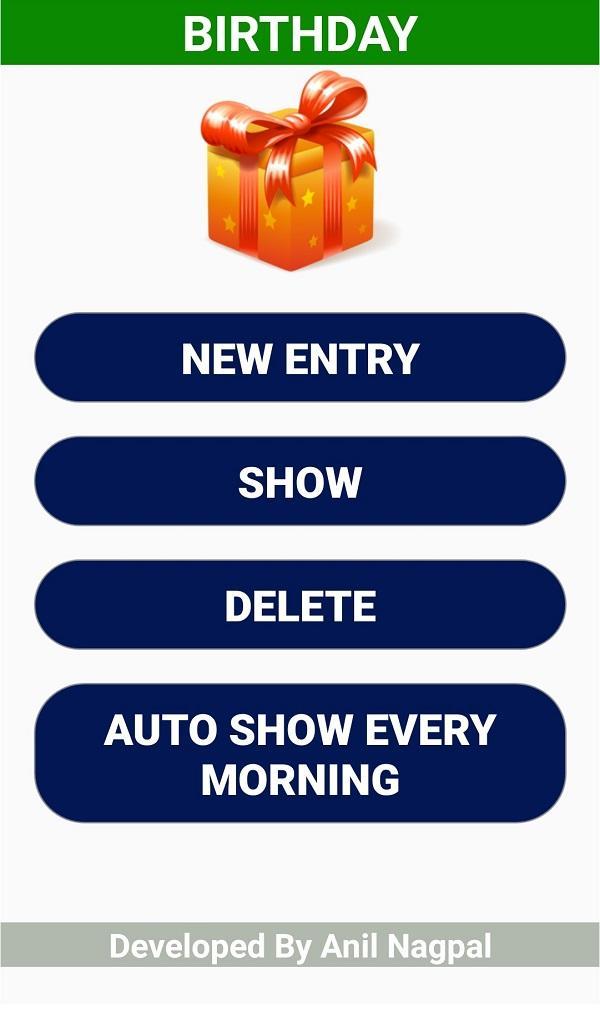 생일 알림 앱은 친척과 친구의 생일이나 기념일을 놓치고 싶지 않은 사람들을위한 것입니다. 이 앱에서는 생일이나 기념일을 놓치고 싶지 않은 모든 사람의 세부 정보를 저장해야합니다. 오늘의, 내일, 월별 또는 모든 세부 사항을 나중에 볼 수 있습니다. 전화를 걸거나 메시지를 보내거나 원하는 사람에게 Whats-App을 보낼 수 있습니다. 매일 아침 앱은 그날 생일이나 기념일이 발생하는 사람들의 세부 정보를 보여줍니다.