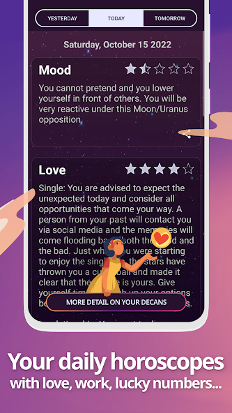 하루를 묘사 할 두 문장 (또는 간단한 Astrolis 별자리?)에 정착하지 마십시오. 일?, 분위기?, 건강?, 낭만적 인 관계 또는 행운의 숫자와 같은 조디악 점성술의 다양한 측면에 대한 많은 세부 사항을 발견하십시오.